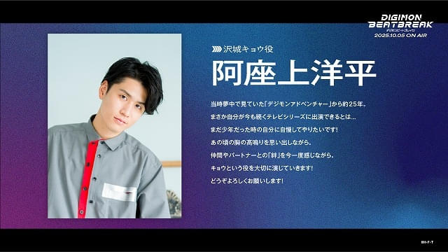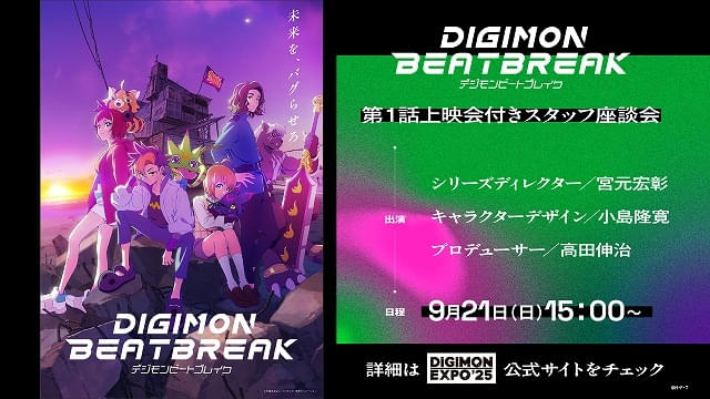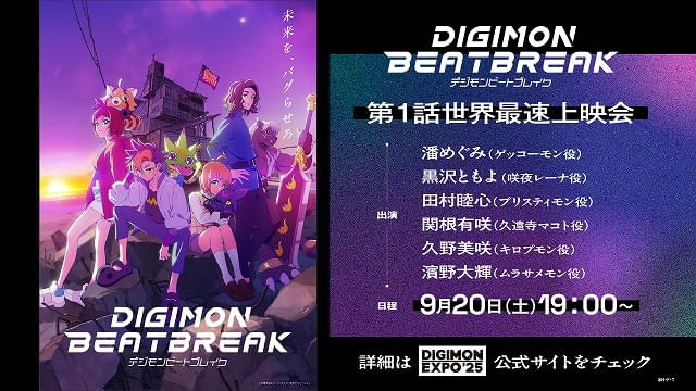 東京ドームシティ・プリズムホールで行われる「DIGIMON EXPO’25」内で9月20日開催の第1話世界最速上映会に藩、黒沢、田村、関根、久野、濱野が登壇することも決定した。21日に実施される、第1話上映会付きスタッフ座談会には、シリーズディレクターの宮元宏彰、キャラクターデザインの小島隆寛、プロデューサーの高田伸治が出演する。8月8日まで1次抽選、8月15~22日に2次抽選を受け付ける。