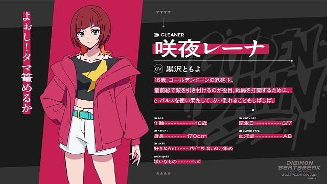 今回発表されたキャストは、トモロウが所属することになる、凶悪なデジモン事件を解決する賞金稼ぎ“クリーナー”たちのチーム「ゴールデンドーン」のメンバーと、そのパートナーデジモンたち。最前線で敵を引き付けるチームの鉄砲玉・咲夜レーナ役を黒沢、レーナと幼い頃から家族同然に育ってきたプリスティモン役を田村が担当。チームの分析及び「面倒くさいこと」担当(レーナ談)の久遠寺マコト役を関根、マコトのパートナーデジモンでオタク気質のキロプモン役を久野が務める。チームリーダーで、最強クラスの実力を誇る天才クリーナーの沢城キョウを阿座上、キョウのパートナーデジモンで圧倒的な強さを誇るムラサメモンを濱野が演じる。