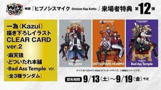 なお、9月2日から全国66館で、「映画 ヒプノシスマイク -Division Rap Battle-」のリバイバル上映を実施中。新たな入場特典として、9月12日まで第11弾、9月13~19日に第12弾を配布する。どちらも一為(Kazui)による描き下ろしイラストを使用したクリアーカードのVer.2で、第11弾では「Buster Bros!!!」「MAD TRIGGER CREW」「Fling Posse」の、第12弾では「麻天狼」「どついたれ本舗」「Bad Ass Temple」の各3種がランダム配布される。