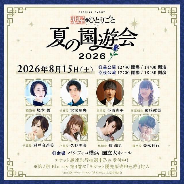 26年8月15日にパシフィコ横浜・国立大ホールで開催されるスペシャルイベント「薬屋のひとりごと ~夏の園遊会 2026~」に、瀬戸、高順役の小西克幸、玉葉妃役の種﨑敦美、小蘭役の久野美咲、馬閃役の橘龍丸、羅半役の豊永利行が出演することも明らかになった。悠木、大塚とともに第1期、第2期の生アフレコや新作の朗読劇、作品トークなどを繰り広げる。チケット価格は8000~1万1000円で、優先販売申込み券は発売中の第2期ブルーレイ第4巻に封入されている。