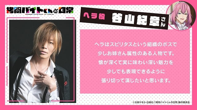 谷山が演じるヘラは「スピリタス」の敏腕社長で、会社設立前はシウとともに拷問師として活動していたという経歴の持ち主。安田が担当するノエは、幼い頃に自分を拾ってくれたヘラを慕う「スピリタス」の社員で、事務仕事で会社を支えるが拷問はできないというキャラクターだ。