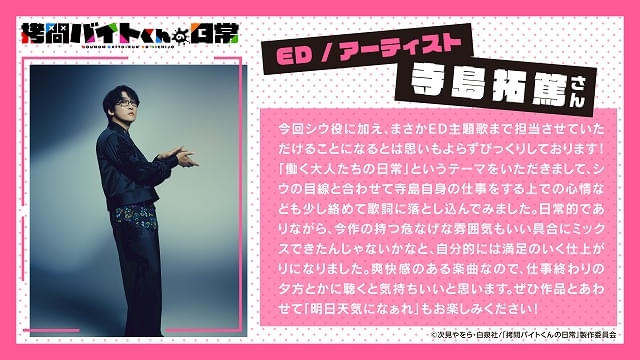 「働く大人たちの日常」というテーマをいただきまして、シウの目線と合わせて寺島自身の仕事をする上での心情なども少し絡めて歌詞に落とし込んでみました。日常的でありながら、今作のもつ危なげな雰囲気もいい具合にミックスできたんじゃないかなと、自分的には満足のいく仕上がりになりました。爽快感のある楽曲なので、仕事終わりの夕方とかに聴くと気持ちいいと思います。