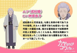 森川はカヤの父・カヤパパ(佐藤静夫)役、能登はカヤの母・カヤママ(佐藤未来)役を担当。戸松はカヤの母方のおばにあたる戎杜家7代目当主・ナナ(戎杜七奈)役、カヤの祖母で未来と七奈の母である当代随一の霊能力者・ムツ(戎杜睦)役を務める。
