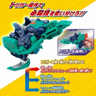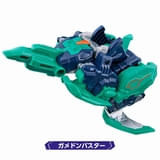 さらにバスターモードでは、トリガーを長押しすることでサウンドギミックが発動。長押し1回目では“ガメドンアクアシュート”の連射音、2回目では押す時間によって技が変わり、ショートチャージでガード技“ガメドンリフレクトシュート”、フルチャージで最強必殺技の“ガメドンファイナルバスター”の発動音が鳴り響く。技を使い分けることで、なりきり遊びがさらに楽しくなるぞ!!