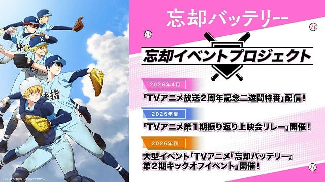 また、「忘却イベントプロジェクト」の始動も発表。2026年4月にアニメ「忘却バッテリー」が放送2周年を迎えることを記念して「TVアニメ放送2周年記念二遊間特番」が配信されるほか、26年夏には「TVアニメ第1期振り返り上映会リレー」と題して、舞台挨拶付き第1期振り返り上映会をリレー形式で複数回実施する。26年秋には、大型イベント「TVアニメ『忘却バッテリー』第2期キックオフイベント」が開催される。