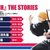 特別企画「TV ANIMATION 『BLEACH』 THE STORIES」は、アニメ「BLEACH」のこれまでのシリーズ各編を振り返るもの。同企画の皮切りとなるのが、原作者・久保帯人氏が描いた歴代の黒崎一護が連なるイラストを、アニメイラストとして新たに描くスペシャルビジュアル。さらに、「BLEACH」アニメ公式YouTubeチャンネルでは、「死神代行篇」から「千年血戦篇」の第3クール「相剋譚」が順次配信されるほか、歴代オープニング&エンディング映像、各編のメインキャストを集めた座談会インタビュー動画の公開が予定されている。
