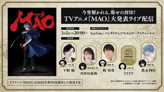 また、3月2日午後8時からYouTubeの「バンダイナムコフィルムワークスチャンネル」で、特番「今宵解かれる、報せの封印!TVアニメ『MAO』大発表ライブ配信」が生配信されることも決まった。摩緒役の梶裕貴、菜花役の川井田夏海、百火役の下野紘、華紋役の豊永利行に加え、未発表の式神の少年・乙弥役のキャストが出演し、最新情報を公開する。