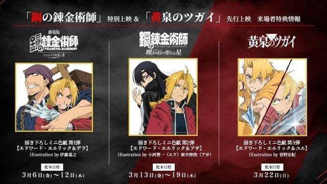 入場特典の描き下ろしミニ色紙では「鋼の錬金術師」と「黄泉のツガイ」のキャラクターが共演。3月6~12日の「シャンバラを征く者」特別上映では、03年放送の「鋼の錬金術師」でキャラクターデザインを務めた伊藤嘉之による「エドワード・エルリック&デラ」を、3月13~19日の「嘆きの丘の聖なる星」特別上映では、同作のキャラクターデザインを務めた小西賢一と、「黄泉のツガイ」でキャラクターデザインを担当する新井伸浩による「エドワード・エルリック&アサ」を配布。3月22日の「黄泉のツガイ」先行上映(ライブビューイング含む)では、09年の「鋼の錬金術師 FULLMETAL ALCHEMIST」にキャラクターデザインとして参加した菅野宏紀による「エドワード・エルリック&ユル」がプレゼントされる。