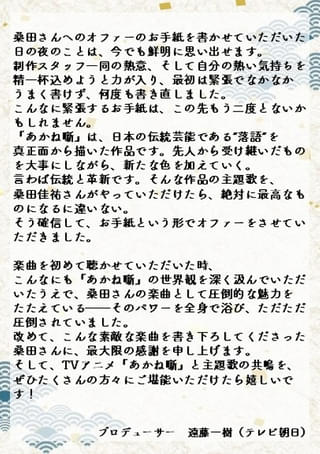 制作スタッフ一同の熱意、そして自分の熱い気持ちを精一杯込めようと力が入り、最初は緊張でなかなかうまく書けず、何度も書き直しました。こんなに緊張するお手紙は、この先もう二度とないかもしれません。