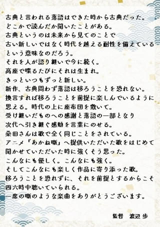 それを人が語り継いで今に続く。高座で喋るたびにそれは生まれ。きっといつもずっと新しい。新作、古典問わず落語は移ろうことを恐れない。換言すれば移ろうことを前提に楽しんでいるように思える。時代の上に座布団を敷いて。受け継いだものへの感謝と落語の一部となり次代へ引き継ぐ感動を言葉にのせる。