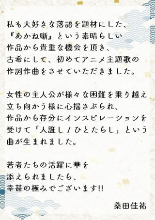 そして、TVアニメ『あかね噺』と主題歌の共鳴を、ぜひたくさんの方々にご堪能いただけたら嬉しいです︕
