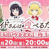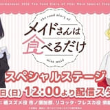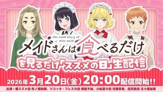 放送直前特番「テレビアニメ『メイドさんは食べるだけ』を見るだけ『スズメの日』生配信」は、“世界スズメの日”にちなんだ3月20日の午後8時から「ハピネット【アニメ公式】YouTubeチャンネル」で配信。市ノ瀬、リコッタ・フレスカ役の須能千裕、小松菜々役の河瀬茉希、信月杏役の五十嵐裕美が出演し、最新情報などを公開する。