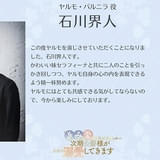 この度ヤルモを演じさせていただくことになりました、石川界人です。かわいい妹セラフィーナと共に二人のことを引っかき回しつつ、ヤルモ自身の心の内を表現できるよう精一杯努めます。ヤルモにはとても共感できる気がしてならないので、今から楽しみにしております。