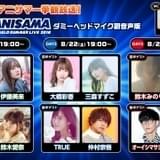 「アニサマ2020」が新型コロナウイルスの影響で開催延期となったことをうけて企画されたのが、ちょっと大人な生配信ライブ「アニサマナイト」。出演アーティストはオーイシマサヨシ、鈴木愛奈、鈴木雅之、鈴木愛理。TRUE、仲村宗悟、早見沙織、三森すずこ、森口博子。神奈川のライブハウスレストラン「Billboard Live YOKOHAMA」での彼らのステージの模様を、ニコニコ生放送で8月30日午後7~10時に配信する。同サイト()で発売中のネットチケット(前売り券)は、プレミアム会員が4900ニコニコポイント (税込4900円)、一般会員が5500ニコニコポイント (税込5500円)。