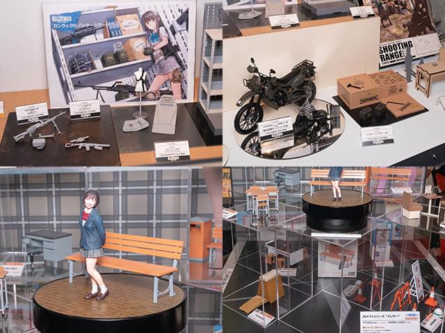 前回レポートした静岡ホビーショーから、トミーテックのリトルアーモリーシリーズ(左上、右上)。1/12スケールのミリタリー系アイテムやオリジナルキャラクター(figma化もされています)を展開中。その銃器は他の追随を許さない豊富さ! ハセガワも以前から1/12サイズの小物をプラモデルで展開中(左下、右下)。こちらは机&椅子や跳び箱等、身の回りのアイテム中心です。1/12サイズのレジン製フィギュア、JKメイトシリーズの展開も始めています。