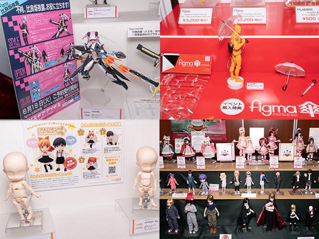 マックスファクトリーはfigma新作の展示(左上)やイベント購入特典の傘(右上)。グッドスマイルカンパニーは1/12ではありませんが、ねんどろいどどーるの素体展示(左下)。ドールメーカーのアゾンはさまざまなタイプのドールを並べ、販売も行っていました(右下)。アゾンのドールでは、1/12サイズのボディも出ています。他にもメガハウスやアオシマ、トミーテックなどが出展していました。