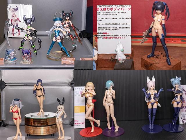 オリジナルの可動フィギュアや交換パーツあれこれ。原型師の遠那かんし氏のオリジナルカラーレジンキット(左上)といったフルセットの他に、卓球模型の交換用まえばりボディパーツ(右上)やQEeeeeNの交換用の水着ボディ(左下)のような身体だけのものも。コトブキヤのプラモデル、メガミデバイス用の改造パーツセット(右下)はメガミデバイスの開発をしている鳥山とりを氏のRAMPAGE Ghost自らの出展です。