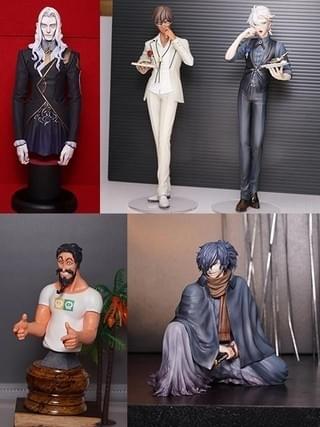 男性サーヴァントも多数登場。左上はヴラド三世胸像(MIDORO)、右上はアルジュナ フォンダン・オ・ショコラ&カルナ ガトー・オ・ショコラ(FOX FRAME)、左下はルルハワの黒ひげ(ヤツメウナギ)、右下は岡田以蔵(カーブモデルズ)。今回男性キャラで多かったのは岡田以蔵で、5体見かけました。