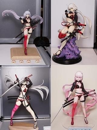 左上はセイバー/女王メイヴ(fullscale)、右上は概念礼装の「忠犬待ったなし」(ねんどこねこねこ)。沖田総司〔オルタ〕も人気モチーフで、7体見かけました。右下は、はちみつ工房のもの。右下のライダー/アルトリア・ペンドラゴン〔オルタ〕ライダーは小抹香からで、未塗装ながら大ボリューム!