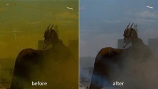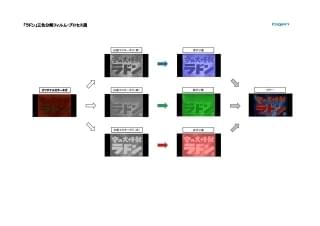 復元プロセスを図に示す。もちろんこの手順でリマスターすることも可能だったが、いくつか問題が存在している。ネガからコピーされたポジ像は1世代劣化しているし、3本のフィルムが個別に収縮し、ダメージもあるため、像のズレる部分が出てくる。古いカラー印刷で見られる「版ズレ」のような現象である。