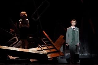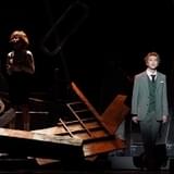 迫力のある舞台装置とその使い方のうまさも、原作が漫画である本作を魅力的に描いている要素のひとつ。スパイである〈黄昏〉が幼い頃に瓦礫の中で泣いている場面や、場面を移動しながらのアクションシーンではセットがくるくると回転するように変化し、舞台全体が動いているような雰囲気を感じます。また、頭上のモニターでは時折キャラクターの心の声やト書きが映し出され、漫画的な笑いを生みだしていました。スタイリッシュで豪華な舞台装置やセットだけでなく、例えばイーデン校の受験日に暴れる牛はアナログに登場するなど、その緩急も楽しく、シリアスとコメディの両方をもつ物語から目が離せません。