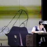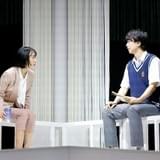 雨の音、電車の揺れ、そして岡宮来夢さんが演じる高校生・タカオのモノローグから物語は静かにスタートしました。出演者が目を合わせることもなく舞台を歩き、電車の音に合わせて身体を揺らす。そういった動きから街の雑踏や人混み、さらには近くに人はたくさんいるのに他人であることの都会の距離感も伝わります。