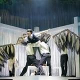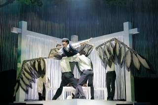 また、演出面を見ていくと、背景に今作のキーワードにもなる万葉集の一編が映し出されたり、アニメーションでも印象的だった雨が布の動きで表現されたり、カラスのパペットが踊るように人混みを駆け抜けたりと舞台らしい手法も多く使われていました。タカオがデッサンする手元がOHPによって映し出されるのもそのひとつでしょう。