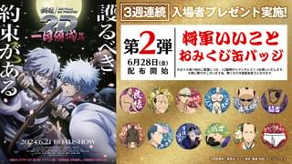 第2弾入場特典として、「一国傾城篇」のキーマンである、江戸幕府の若き征夷大将軍・徳川茂茂にスポットを当てた「将軍いいことおみくじ缶バッジ」が配布される。登場する度にさまざまな目にあい、強烈なインパクトを残してきた茂茂。バッジの絵柄は、そんな茂茂の勇姿や、象徴的な姿「もっさりブリーフ」などを収めた全12種。ホログラム仕様に加え、シーンに合わせた一言おみくじも添えられている。