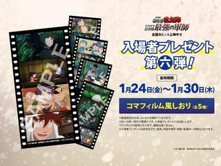 このほか、本日公開「SK∞ エスケーエイト EXTRA PART」は1週目入場特典「千葉道徳描き下ろしA5イラストカード【喜屋武 暦・馳河ランガ】」が配布され、公開中の「劇場版 忍たま乱太郎 ドクタケ忍者隊最強の軍師」は第6弾入場特典「コマフィルム風しおり」が登場する。