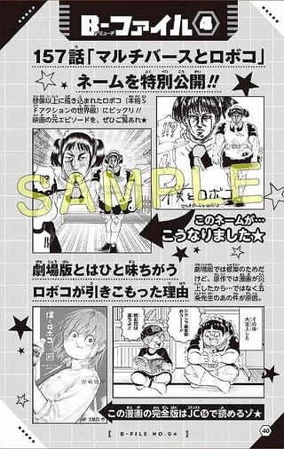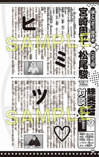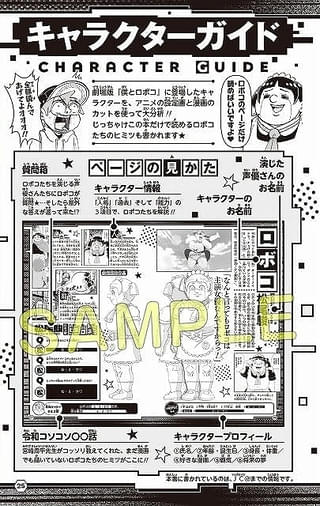 さらに劇場版のストーリーの元となった原作漫画・第157話「マルチバースとロボコ」のネーム(1話分)も掲載されるほか、キャスト陣がロボコからの質問に答える質問箱コーナーや、初めて明かされる秘密の情報を紹介するキャラクターガイド、原作者・宮崎氏とロボコ役・松尾駿(チョコレートプラネット)による「膝突き合わせ対談」など、盛りだくさんの内容となっている。A6サイズで全82ページ。
