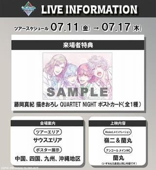 さらに、公開中の「LUPIN THE IIIRD THE MOVIE 不死身の血族」は第2弾入場特典「(秘)原画集 第2弾」、「JUNK WORLD」は第2弾入場特典「A6コンセプトアートカードセット」、「劇場版 うたの☆プリンスさまっ♪ TABOO NIGHT XXXX」は10週目入場特典「藤岡真紀 描きおろし QUARTET NIGHT ポストカード」が登場する。