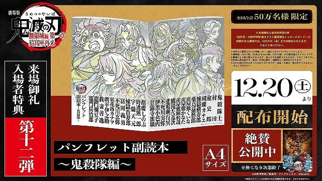 同冊子は、「劇場版『鬼滅の刃』無限城編 第一章 猗窩座再来」に登場する鬼殺隊のキャラクターをテーマに、本編で使用された原画を収録。入場特典のなかでも冊子は人気が高く、第4弾では「スペシャルインタビューブック」、第6弾では「パンフレット副読本~決戦編~」が配布されたが、第12弾にして新たな冊子が登場することになった。
