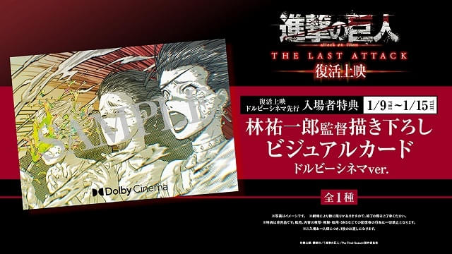 「劇場版『進撃の巨人』完結編 THE LAST ATTACK」の公開1周年を記念して、1月16日より通常版が全国劇場で復活上映される。これに先がけて、1月9日に全国10館でドルビーシネマ版が先行公開。ドルビーシネマ版の上映は「進撃の巨人」シリーズ初となる。