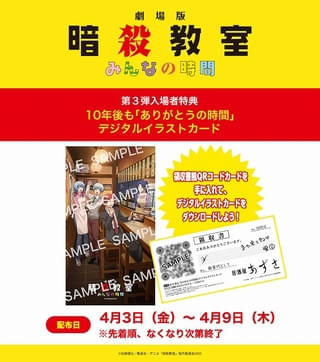 第3弾入場特典は、「10年後も『ありがとうの時間』デジタルイラストカード」。来場時に配布されるQRコードカードからデジタルイラストがダウンロード可能で、同イラストには殺せんせーお気に入りの居酒屋「あずさ」を訪れた、10年後の渚と業の姿が描かれている。